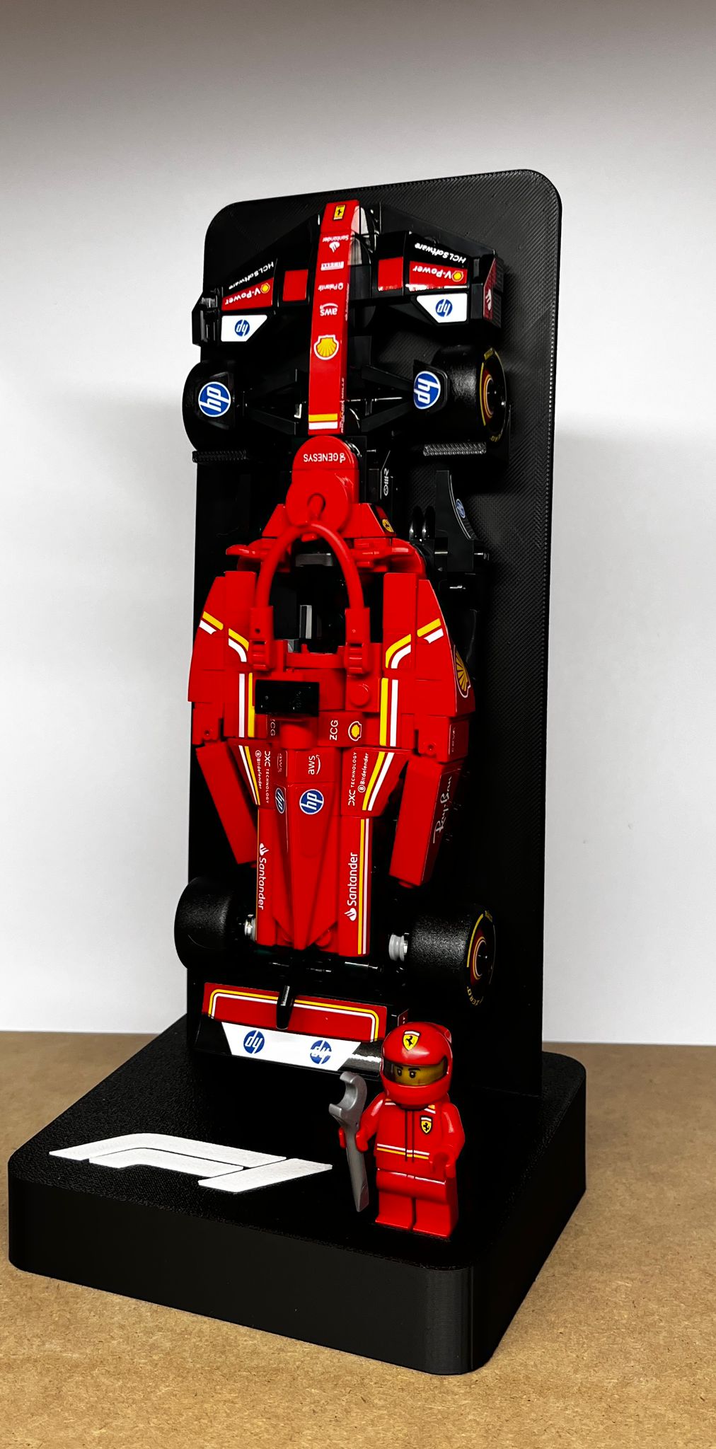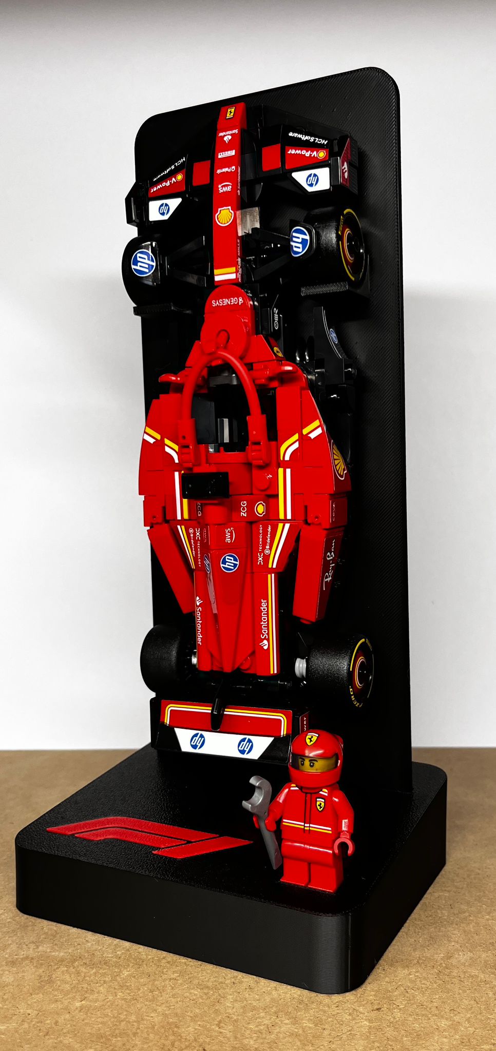 Voorzien van een geïntegreerd F1-logo en ruimte voor het minifig-poppetje in de voet.
